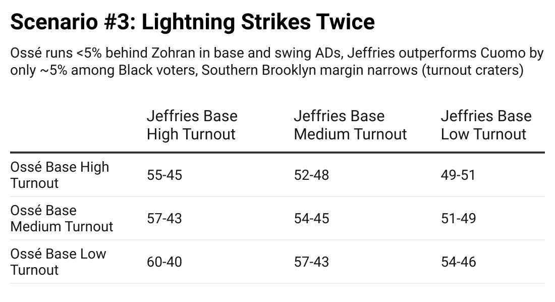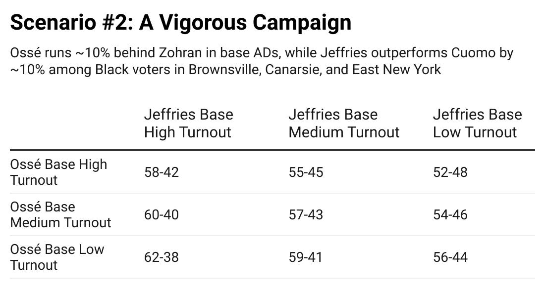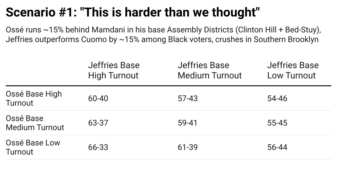 Defeating Jeffries, even with a left-progressive coalition similar to Mamdani’s, would be a herculean task. Without it, the endeavor is lonely and fraught. Most importantly, candidates and coalitions shape (and change) the electorate. Mamdani did this tremendously well, leveraging the political moment into a movement campaign, while maximizing his base on all fronts. However, in a citywide campaign, Mamdani could pull votes from every neighborhood, and maintained many paths to the nomination. Cuomo, need it be repeated, ran a listless and uninspiring effort, overly reliant on money, while failing to motivate his base of older Black and Hispanic Democrats. Jeffries, while marooned in Washington for days and weeks at a time (perhaps his greatest vulnerability), will have the time and money to tend to his working and middle-class base, and enough surrogates to fill in the gaps. While Zohran Mamdani received more votes (39K) than Andrew Cuomo (32K) in NY-8; Eric Adams , the son of Black Brooklyn whose electoral profile is more comparable to Jeffries, won more raw votes than either in 2021 (41K).