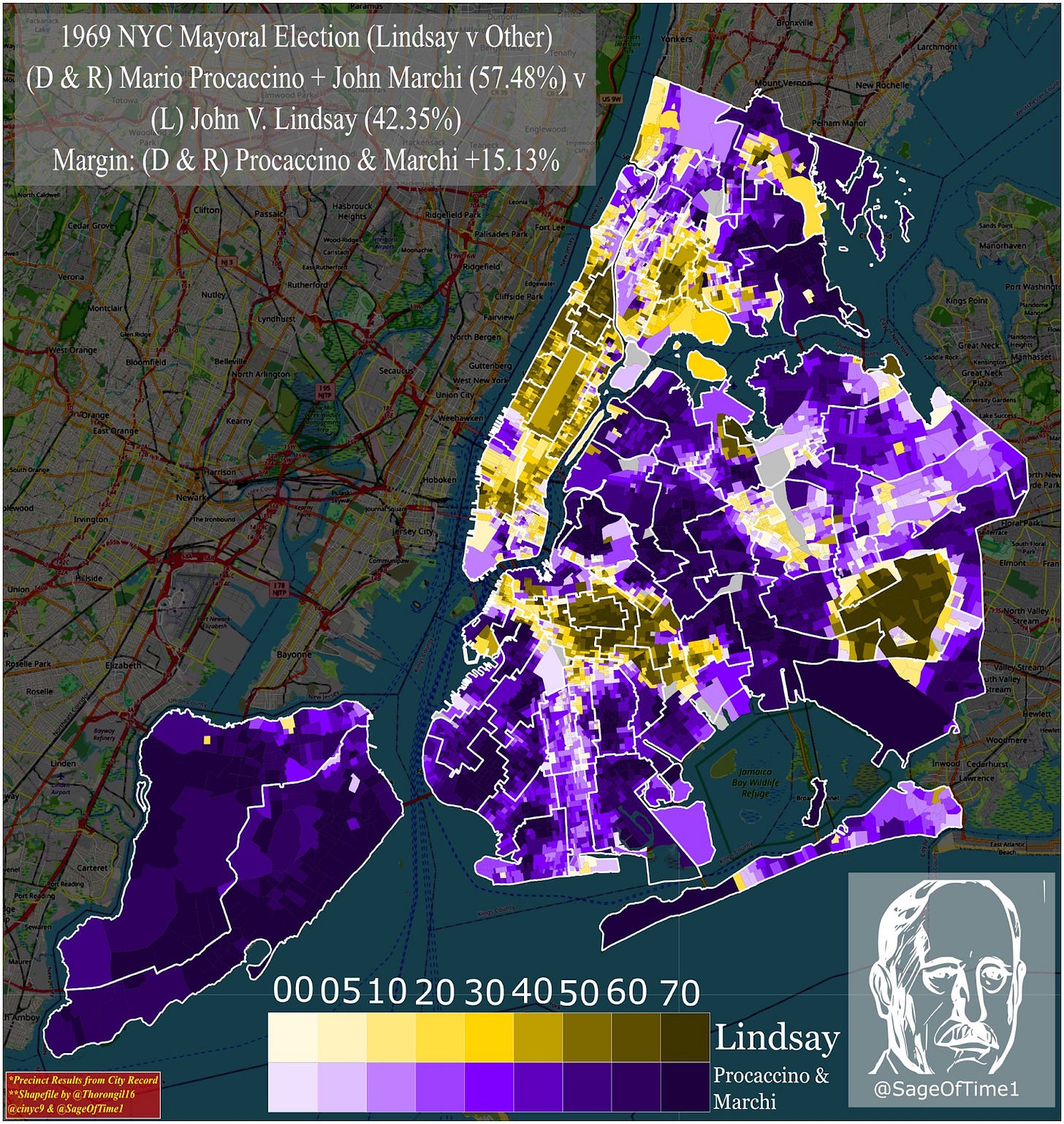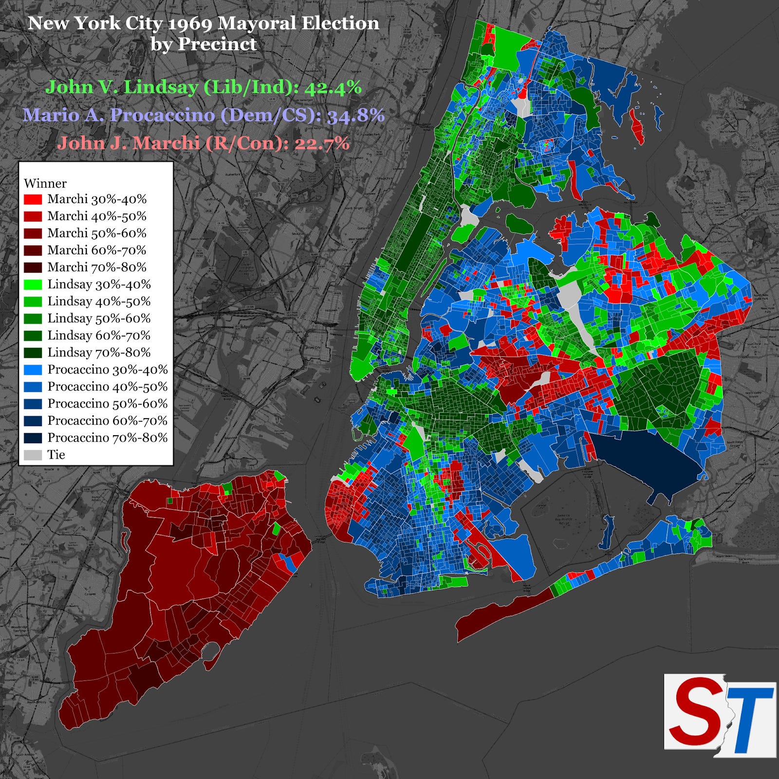 If a picture is worth one-thousand words, then the map of New York City in 1969 tells a story of five boroughs amidst profound demographic and cultural upheaval. From a distance, one can glean the “beautiful people” of Manhattan, who bequeathed near unanimous support to one of their own, John Lindsay; the ancestral Republican outposts of Maspeth and Breezy Point, Bay Ridge and Staten Island, whose votes were delivered to John Marchi; and the sea of outer borough blue, a tide of white ethnic reaction and law-and-order rhetoric on behalf of Mario Procaccino. The migration of Black and Puerto Rican New Yorkers can be seen, block-by-block, in the pro-Lindsay precincts of Central Brooklyn and the South Bronx. The handful of remaining Italians, many of whom supported socialists Vito Marcantonio (and Fiorello La Guardia) in their respective campaigns three decades prior, can be seen as lonely islands of Procaccino holdouts in an ocean of Lindsay support across Harlem.